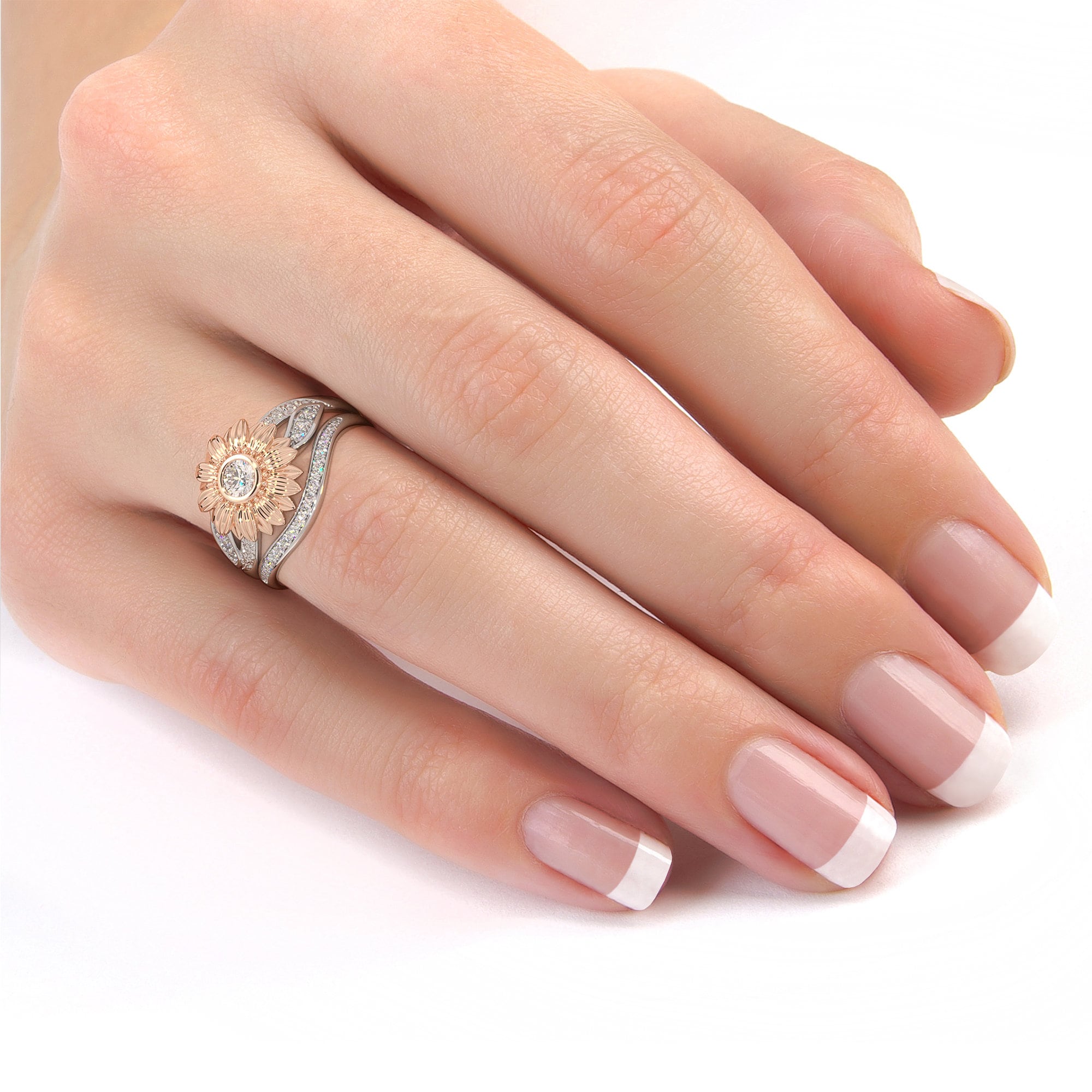 . It features winged detail and shimmering diamonds set in a luxurious rollover. Sunflower Rose Wedding Rings. Shop our custom engagement rings wedding rings bands and other diamond jewelry at Fascinating Diamonds.