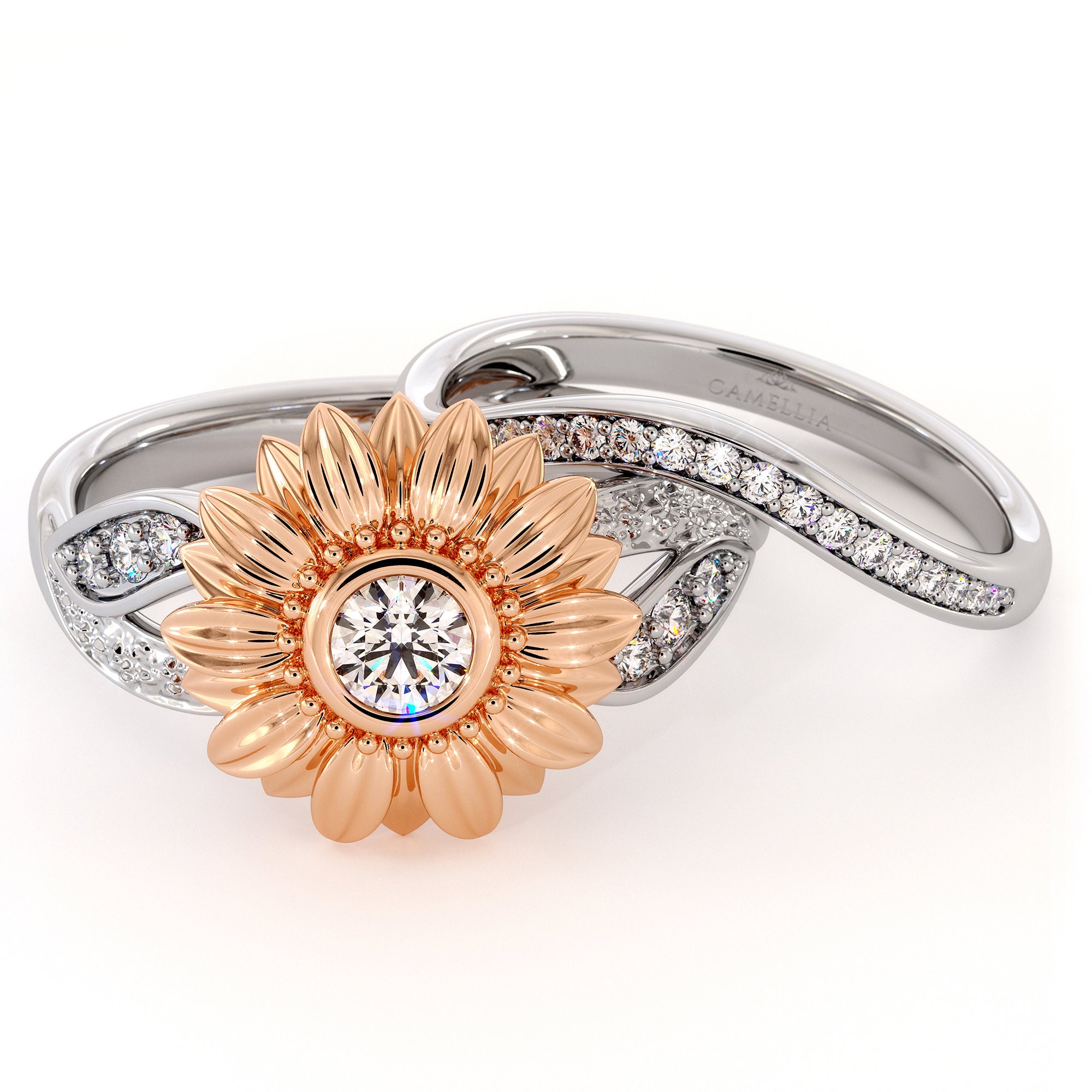 Two Tone Gold Sunflower Engagement Ring Sunflower Diamond Ring Unique Engagement Ring Diamond Flower Ring Camellia Jewelry